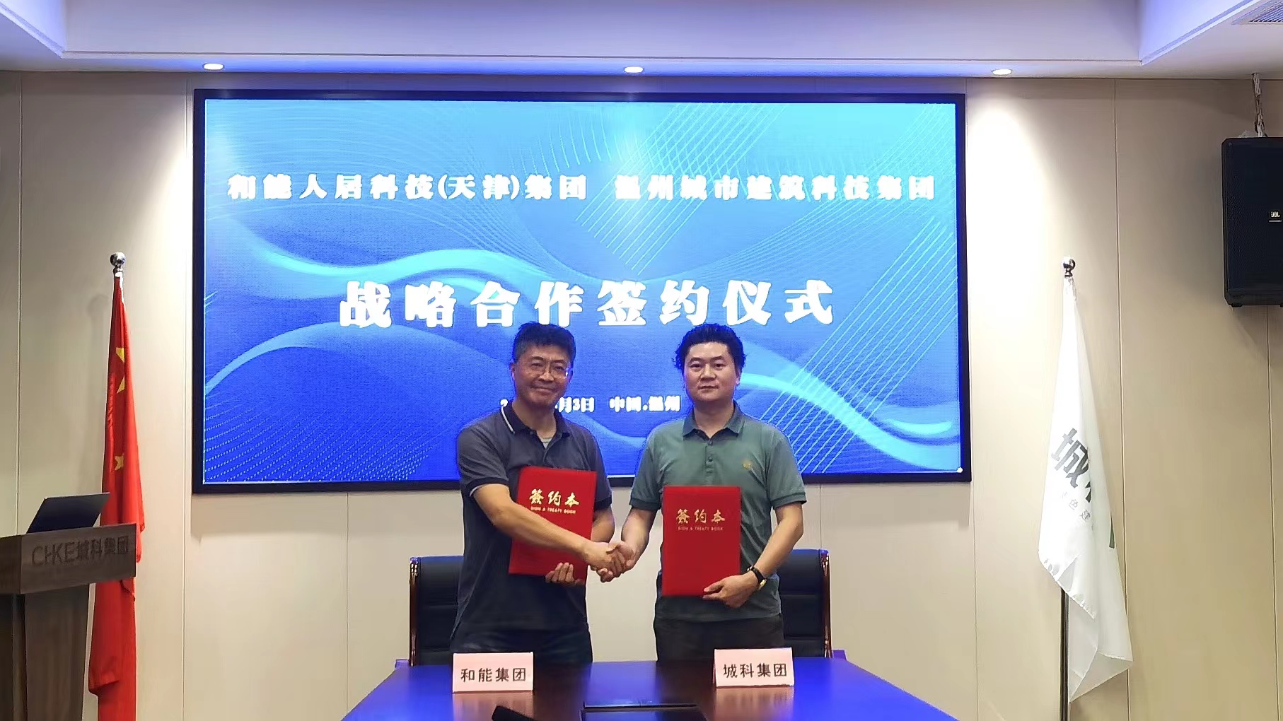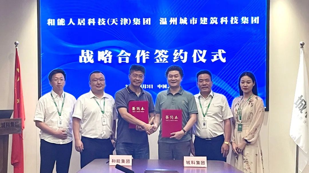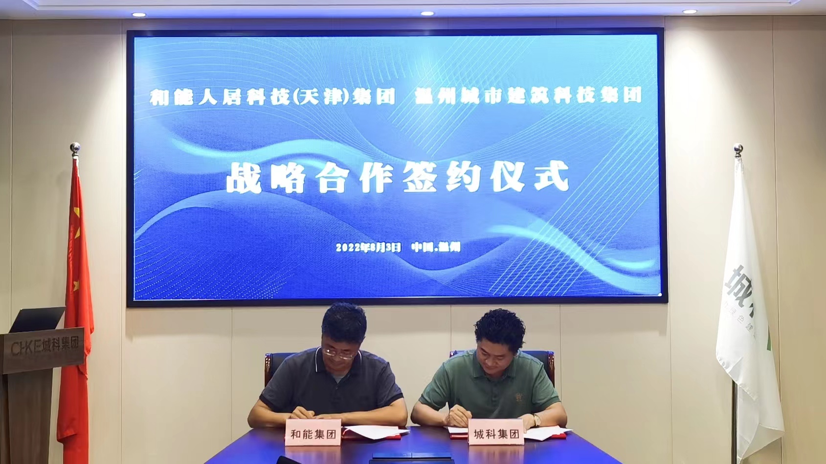 8月3日,和能人居科技集團與溫州城市建筑科技集團有限公司(簡稱:城科集團)簽訂了戰略合作協議。和能人居科技集團副總裁田冠勇與城科集團執行董事、總裁黃國華代表雙方簽署協議。