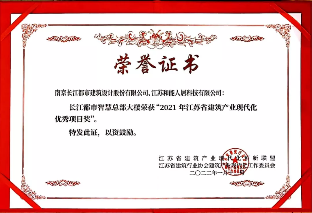 和能人居科技榮獲“2021年度江蘇省建筑產業現代化突出貢獻單位”獎,以及“2021年度江蘇省建筑產業現代化優秀項目獎”,同時,和能人居科技副總裁田冠勇被授予“2021年度江蘇省建筑產業現代化先鋒人物稱號”。